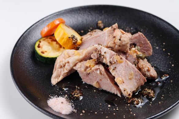 茹でて油を落としてからのオーブン焼きで香ばしく。胡椒のきいた豚ロースにはレモンがよく合うアペタイザー。