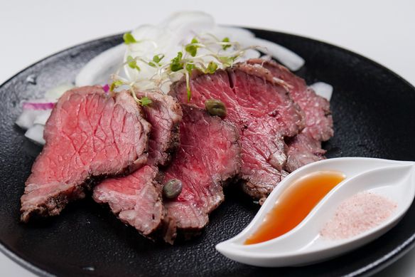 あっさりとした脂と濃厚な赤身を楽しめる部位を銅のフライパンでサッと焼いてからオーブン仕上げです。グレイビーと赤ワインのオニオンソース、岩塩、ブラックペッパー。牛肉らしい歯応えがあります