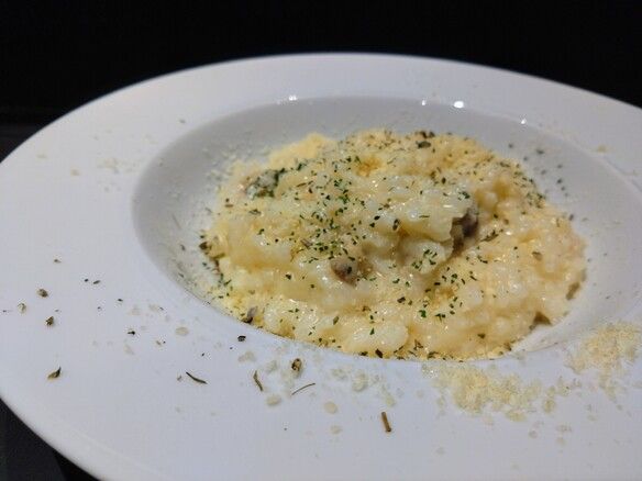 3種のチーズとパンチェッタのクリーミーなリゾットです。ハーブとスパイスも利いています。米200g ※ 米に芯をのこしてあります。苦手な方はオーダーをお控えください