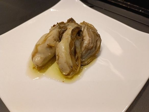じっくり特製のソースとオリーブオイルに漬けた蒸し牡蠣の、バーナー炙り仕上です。2粒