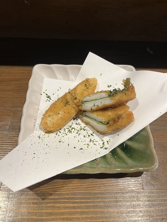 仙台名物の笹かまをシソ、チーズと仲良く揚げたありそうである絶対美味しい一品です!