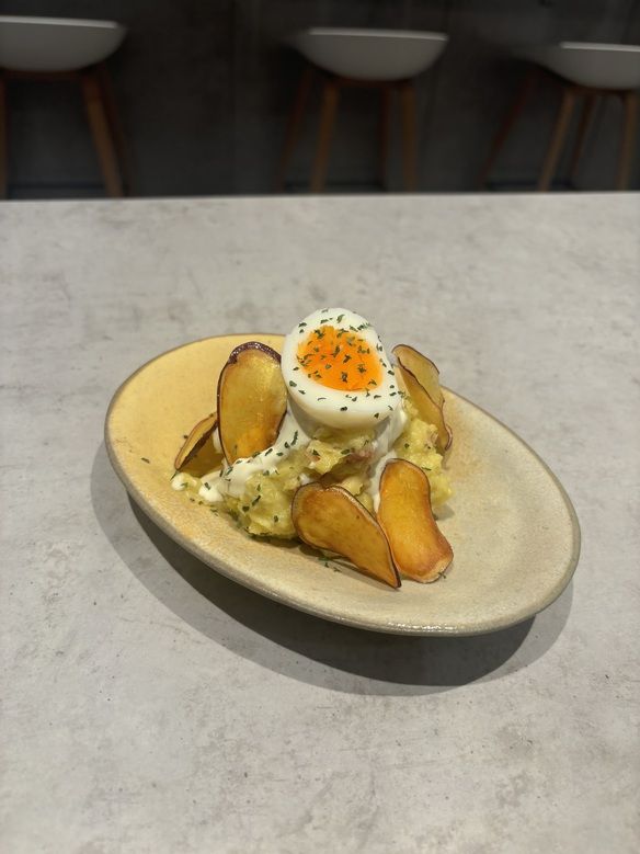 さつまいものほんのりとした甘さのポテトサラダ 半熟卵とカリカリのさつまいもチップスとよく混ぜて食感も楽しみながらお召し上がりください