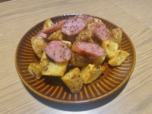 くせになる美味しさ‼︎ ハニーマスタードソースにポテトとウインナーをからめました。