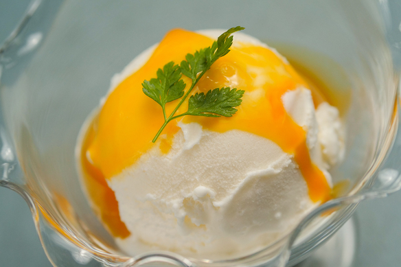 杏仁豆腐がアイスになりました!さっぱりしたマンゴーソースで食後にぴったりのスイーツです。