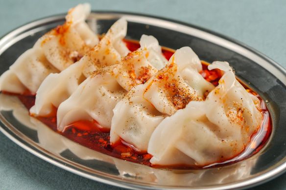 ぷりぷりの水餃子に特製ソースをかけて花椒を効かせた逸品。ビールとおすすめです!