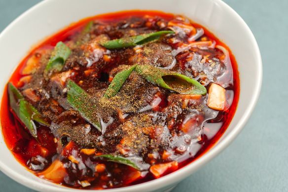 3種の豆板醤と粗挽き牛タンの旨みが閉じ込められた餡が、ツルもち中太麺と絡み中毒性抜群!