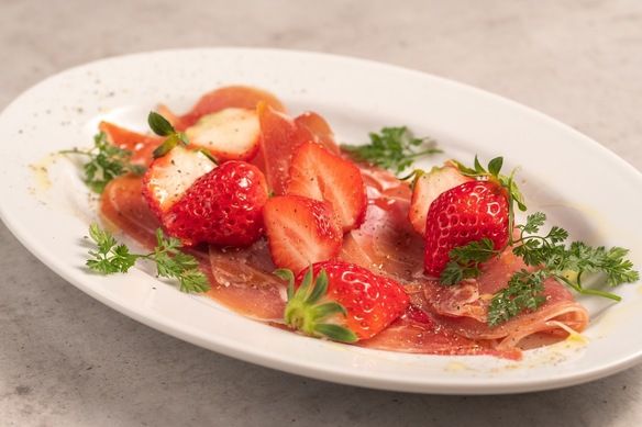 ハモンセラーノに旬のフルーツを合わせた前菜。