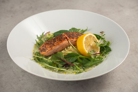 低温調理したレア状態のサーモンに、自家製のほうれん草クリームのソースを合わせました