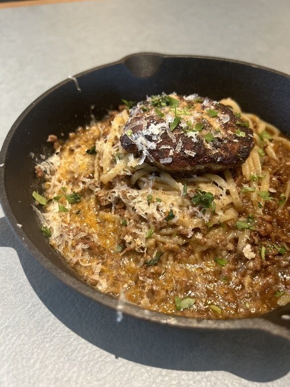 提供直前にオーブンで焼き上げた手ごねハンバーグを乗せ、自家製ボロネーゼソースと合わせました