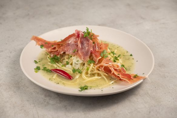 しっかり乳化した本場のペペロンチーノ再現。削りたての生ハムをたっぷりと乗せました。
