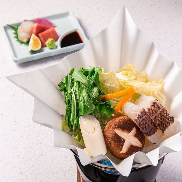 海鮮小鍋、お造り、小鉢3品、ご飯、漬物付き