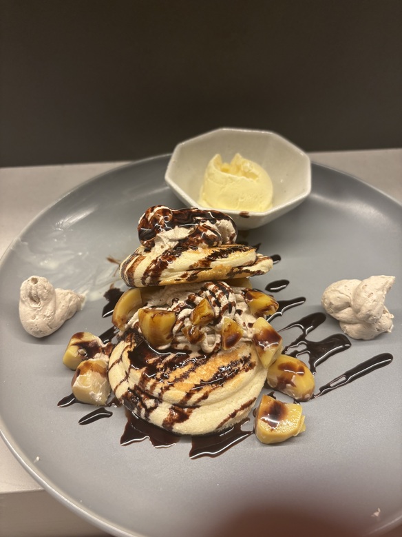 たまごたっぷりの甘さ控えめのワッフルケーキにバナナ、チョコレートとクリームたっぷりの上にバニラアイス乗ってます
