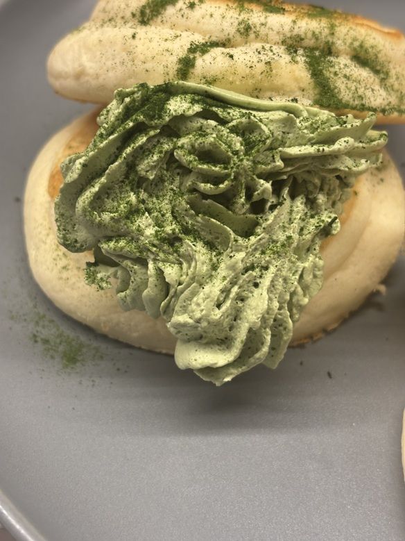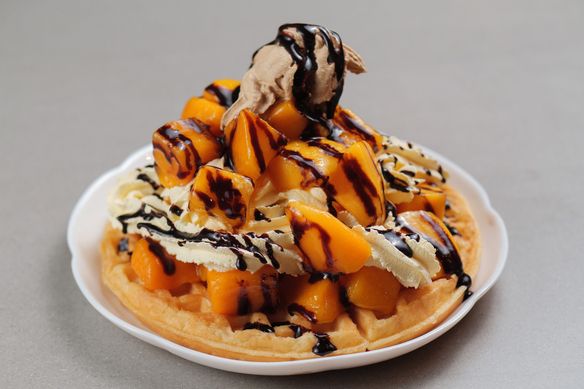 たまごたっぷりの甘さ控えめワッフルにマンゴーといちごクリームたっぷりの上にバニラアイスのってますハーフサイズです