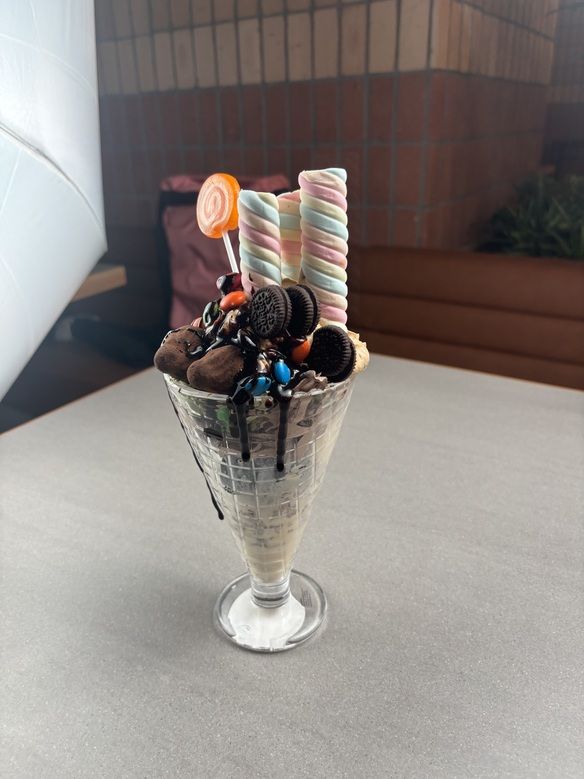 バニラアイスとチョコレートアイスの2つのアイスが楽しめてマシュマロ、キャンディー、チョコレートが モリモリのアメリカンパフェ🌈