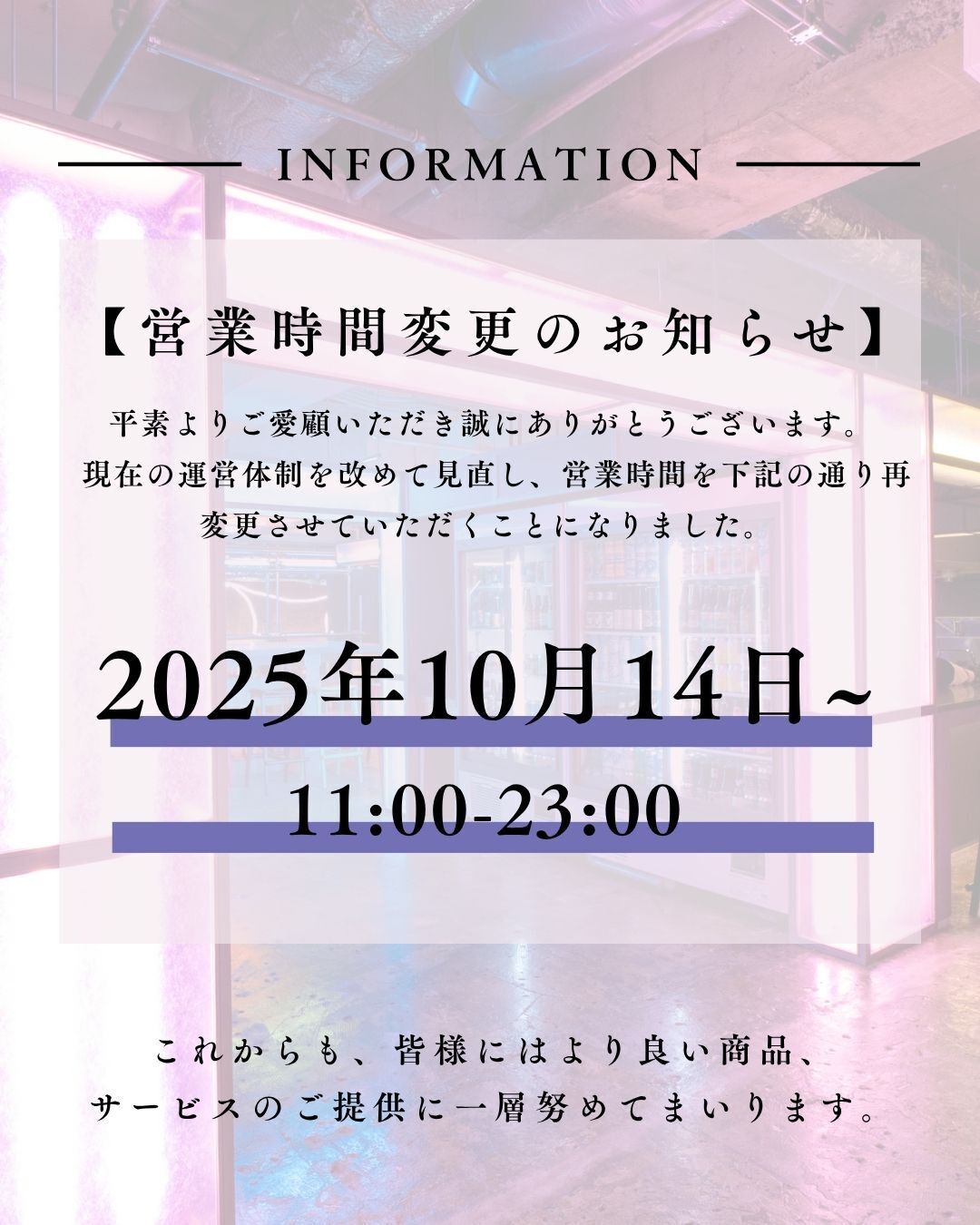 引き続き、皆様の日常に寄り添う、より良いお店づくりにスタッフ一同努めてまいりますので、何卒ご理解とご協力を賜りますようお願い申し上げます。