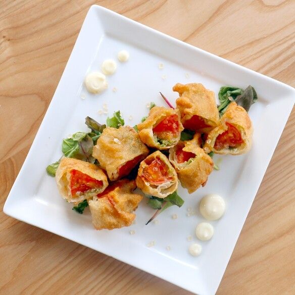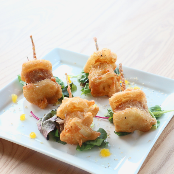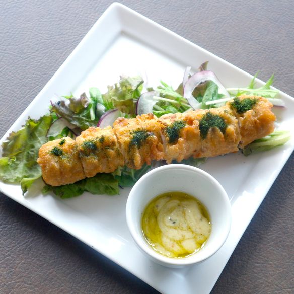 798サクッと揚げた海老天を白ごはんで包み、海苔で巻いた巻きずし風の天むす。大葉と柚子の香りがふわっと広がる、香ばしくて爽やかなグルテンフリーの一品です。