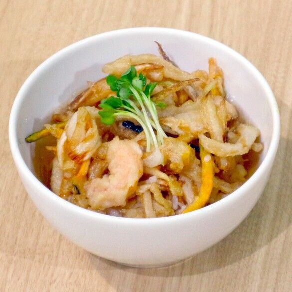 989淡路玉ねぎ、小海老、根菜を合わせた甘みたっぷりのかき揚げに、とろ〜り温玉天をのせたグルテンフリー天丼。香ばしさとまろやかさのバランスが絶妙な一杯です。