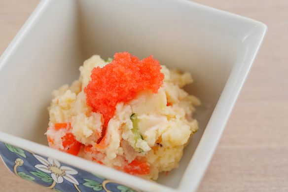 サクサクした山いもに白ごま入りの梅肉をはさんで青じそで巻いた和風惣菜。彩りも涼しげで、初夏のおつまみに最適です。