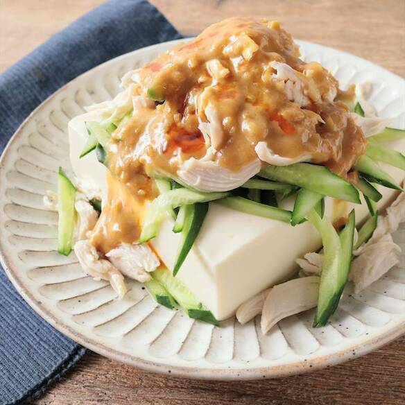 濃厚ごまだれと和えてバンバンジーを豆腐にのせてタンパク質もあり、おつまみに最高かよ🥳