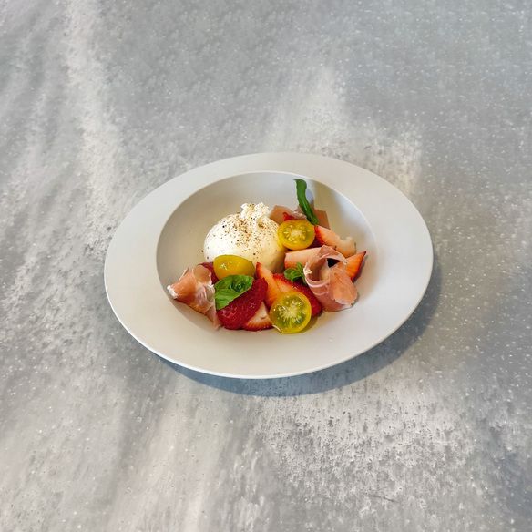 とろけるブラータチーズに旬の果実を合わせて。オリーブオイルとハーブの香りを添えて。