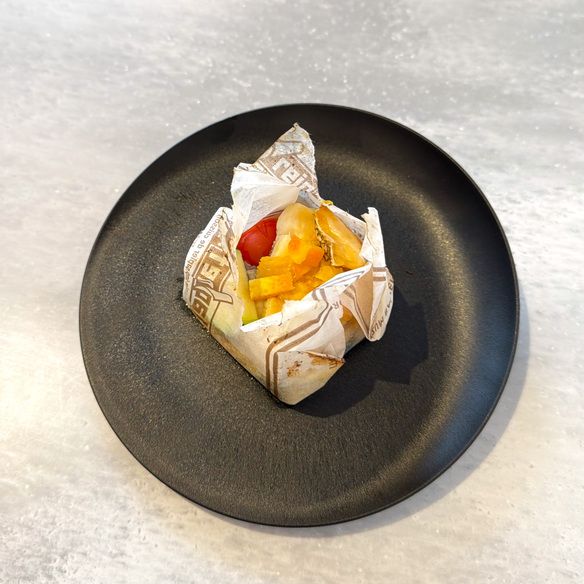 宮崎県ブランドのしまうら真鯛を紙包みにして蒸し焼きに。素材の旨みを閉じ込めた一皿。