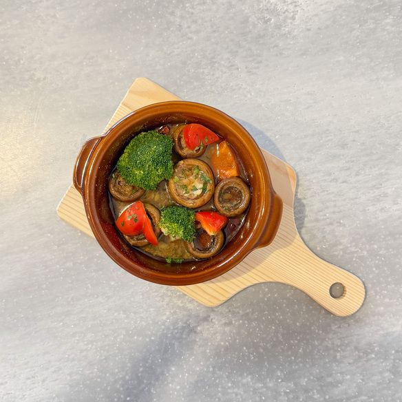 岩手県八幡平ブランド、コクと旨味の強い八幡平マッシュルームをアンチョビ香るオイルでじっくり煮込んだバル料理の定番メニュー。
