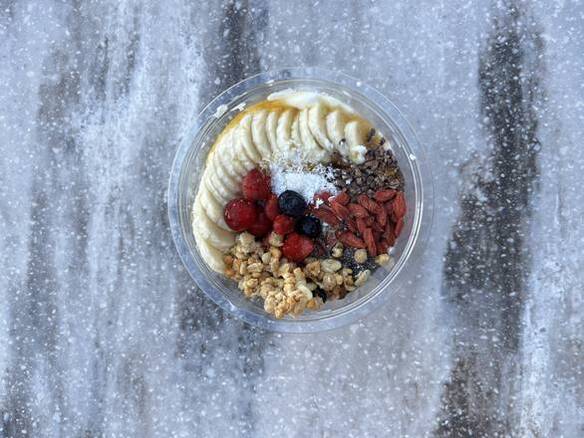 ギリシャヨーグルトに、ベリーやバナナ、グラノーラをたっぷりトッピング。さらに、ゴジベリー、カカオニブ、ココナッツファイン、チアシード、はちみつを加えた、スーパーフード満載の栄養満点ボウル!