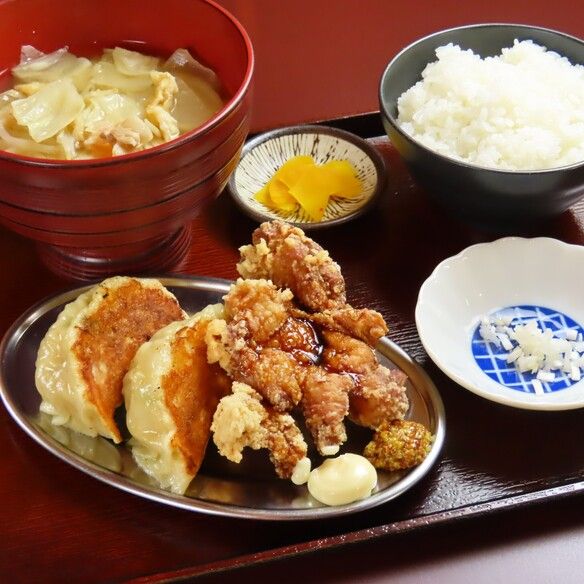 製造所定食(大粒餃子2個たれザンギ1個ご飯味噌汁)