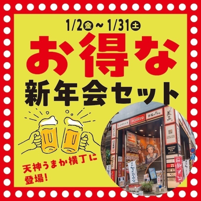 2026年1月31日(土)までの期間限定!福岡天神駅徒歩2分『天神うまか横丁』に、人気メニューを通常より最大500円お得に楽しめる「新年会セット」が登場しています。全6種の「新年会セット」は、ボ...