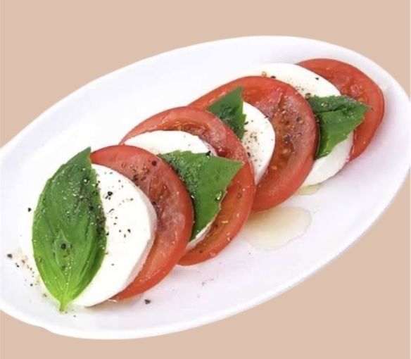 イタリアの定番前菜。瑞々しいトマトと濃厚モッツァレラの調和 完熟トマトの鮮やかな赤、フレッシュモッツァレラチーズの白、バジルの緑。イタリアの国旗を模した美しい定番サラダです。こだわりのオリーブオイルと塩でシンプルに仕上げることで、素材本来の味わいが際立ちます。爽やかな酸味とミルキーなコクが織りなすハーモニーをお楽しみください。