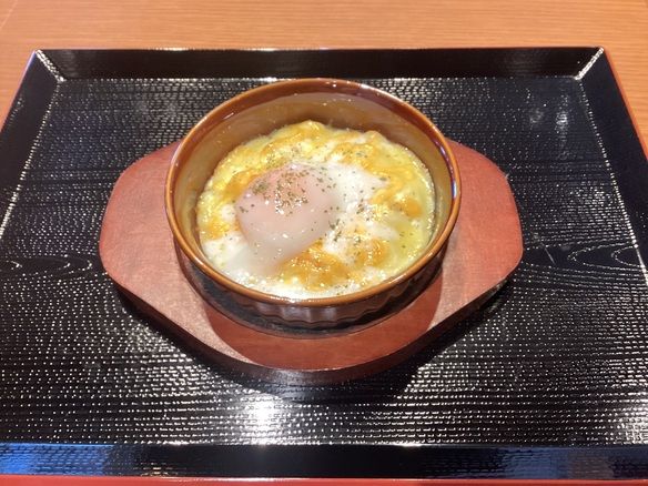 ポテトの上に明太マヨソースとチーズを乗せて、さらに温玉を乗せました!!