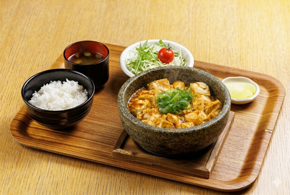 【サウナの日】で人気だった商品が待望のグランドメニューに入りました!!石焼き器での提供なのでグツグツが半端ない!サウナ上がりの整った体に熱々のシビ辛麻婆豆腐は最高の【サ飯】です!