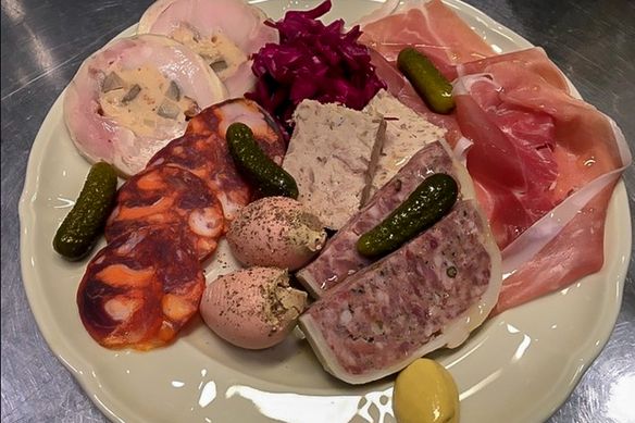 2〜3人前のお肉の盛り合わせ (パテ・ド・カンパーニュ、ポークリエット、生ハム、サラミ、鶏のバロティーヌ、豚肩ロースのハム)