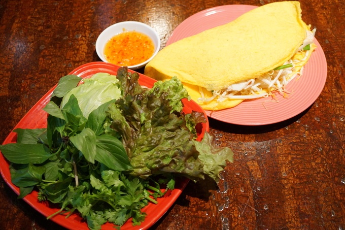 ベトナム風に薄く焼いたココナッツ入り生地でホラパー、パクチー、ミント、豚肉や海老などを包んでいただきます。