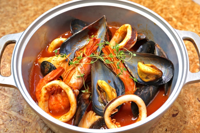 たっぷりのいかやエビ、ムール貝などで具だくさんに仕上げました。スパイシーな味わいが身体を温めてくれる!寒くなるこれからの季節に嬉しい逸品です。(2名様からご注文承ります。)