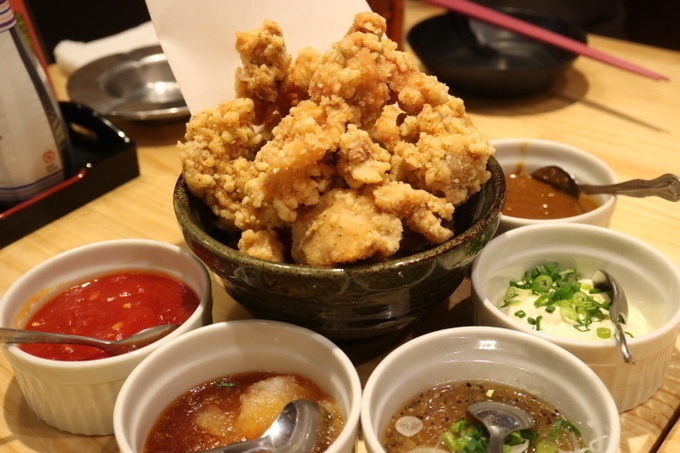 待つこと3、4分。唐揚げが運ばれてきました。一緒にソースが5種類ついてきます。