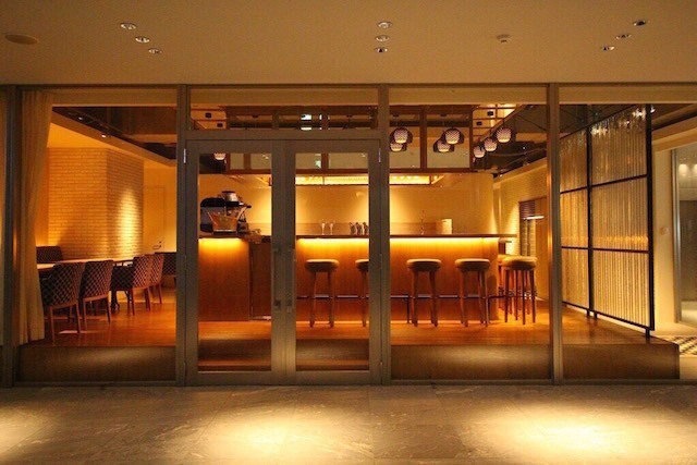 エントランス付近にあるコの字型のバーカウンター。木の素材使いが温かみある雰囲気を演出