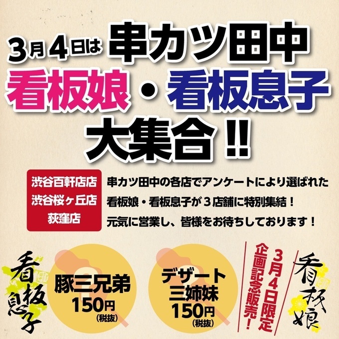 3月4日、『串カツ田中』の看板娘・看板息子が渋谷と荻窪に大集合!各店でアンケートによって選ばれた自慢の店員さんが、限定3店舗に特別集結。さらに、このイベントのためだけに作られたデザート串と豚串が販売されます!安くて美味しくて楽しい『串カツ田中』、もう最高です!