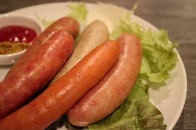 まずは「茹でソーセージの盛り合わせ」。5種類のソーセージが楽しめます。
