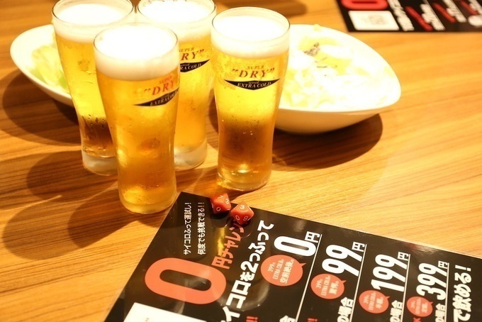 10面のサイコロを2つ振って合計20の場合、エクストラコールドが1杯0円。合計17以上で99円、合計12以上で199円、合計11以下で399円。
