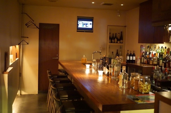 幡ヶ谷の飲み屋が多いエリアの脇道に佇むバーです。横長の窓からはオシャレで綺麗な店内が覗けます。