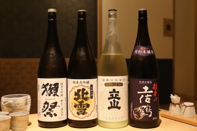 左から「獺祭 磨き三割九分」(1,250円)「北雪 純米大吟醸」(980円)「立山 純米吟醸」(850円)「土佐鶴 超辛口 特別本醸造」(750円)