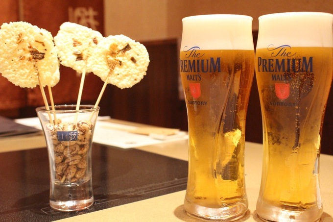 まずはパルメザンチーズと焼きヒレを薄焼きにしたおせんべいとプレミアムモルツで乾杯。