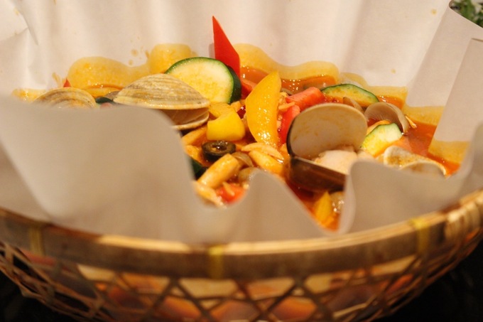 とらふぐとパプリカ、ズッキーニ、きのこ、あさり、オリーブなどと一緒に煮込んだトマトベースのお鍋。