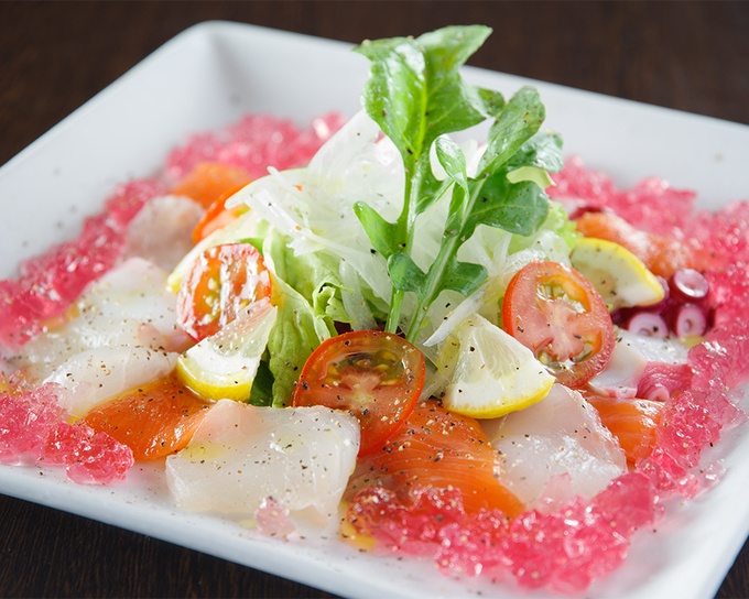 毎日朝に仕入れたお魚をつかった「海鮮のカルパッチョ」は、ソースに「紀州赤い梅酒」を使用しています。