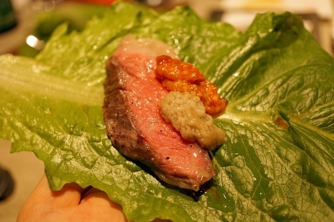 サンチュの代わりにロメインレタスで巻いて。複数ソースを合わせてもヨシ!