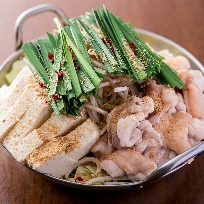 博多名物のモツ鍋。鍋の中には溢れんばかりにたっぷりとモツと野菜が入っています。ニンニクの効いたスープはプリップリのモツと相性が良く、お箸が鍋の方へとどんどん伸びてしまいます。