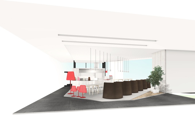 白を基調とした店内には、ピノのブランドカラーである赤を取り入れ、ピノアイスをイメージしたソファが6つ並びます。