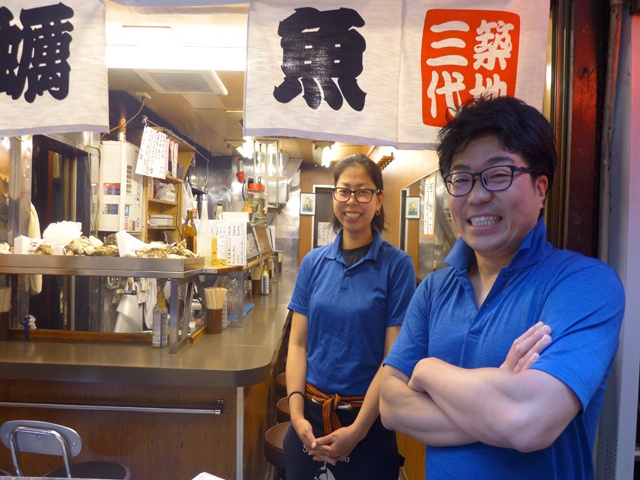 手前:自ら店頭で旨い牡蠣と魚を啓蒙する片又氏。奥:生粋の横丁育ちである店長の平賀氏