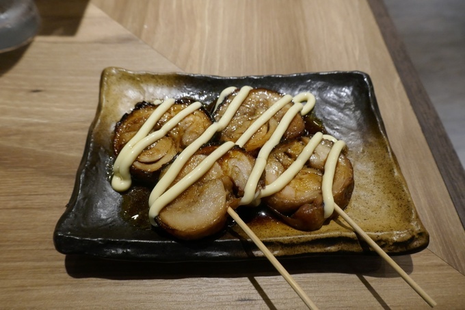 クラシックな串メニューはもちろんですが、ニューウェーブなメニューも用意されていたので、今回は「厚切チキンロール串 2本」490円を注文。